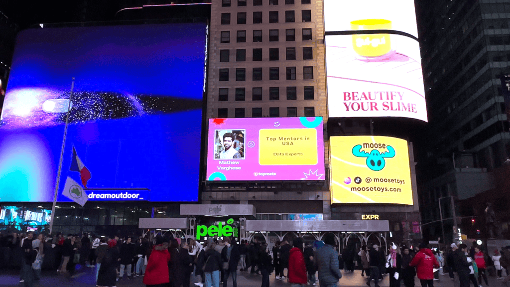 Over time, this consistent engagement led to me being featured among the top data mentors on the platform. As part of this recognition, I was also featured on a Times Square billboard in New York, which was a unique and unexpected highlight of the experience.